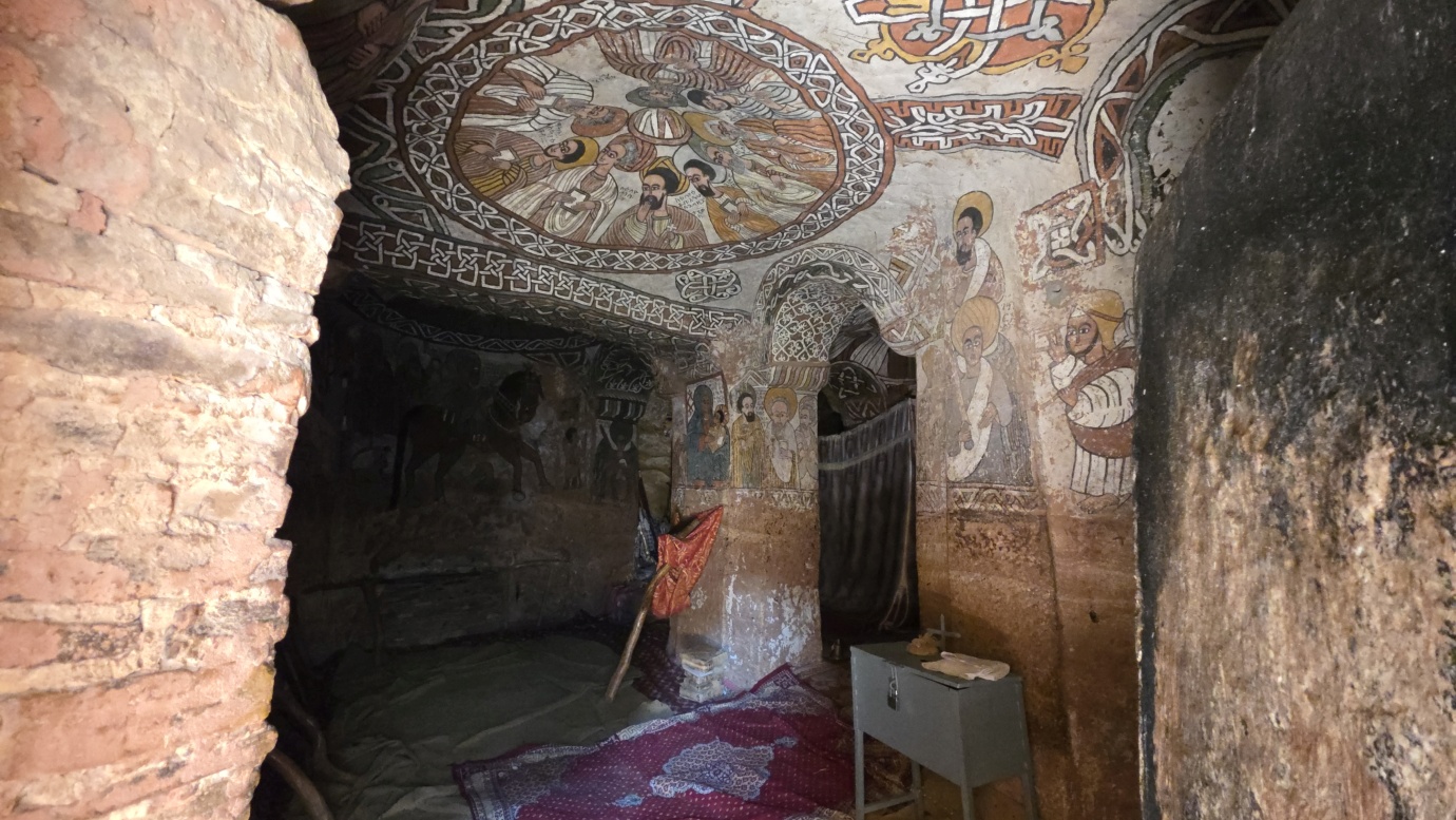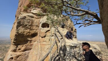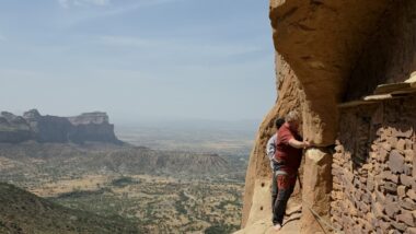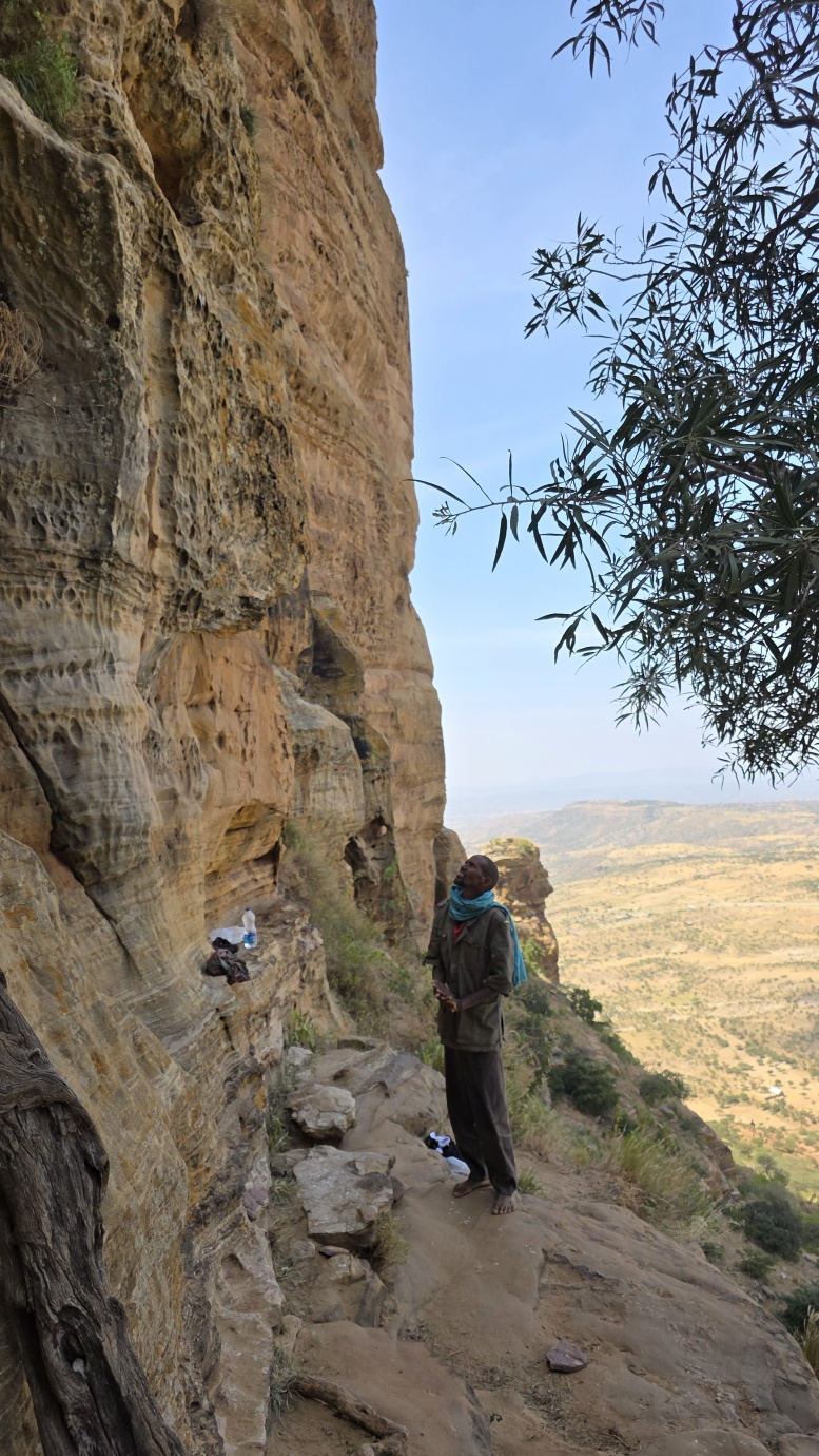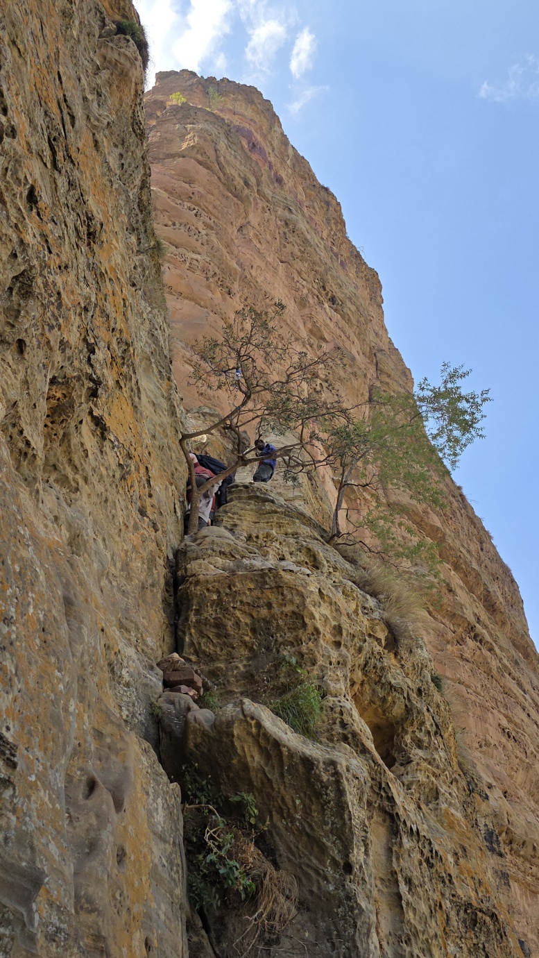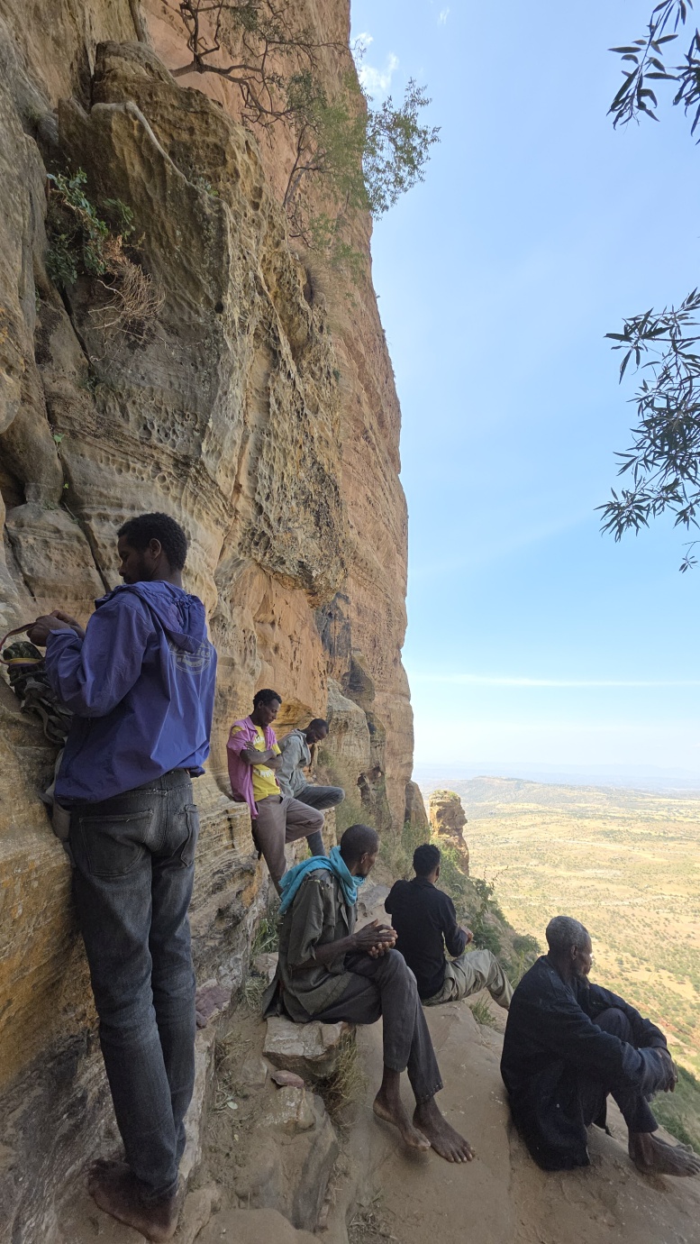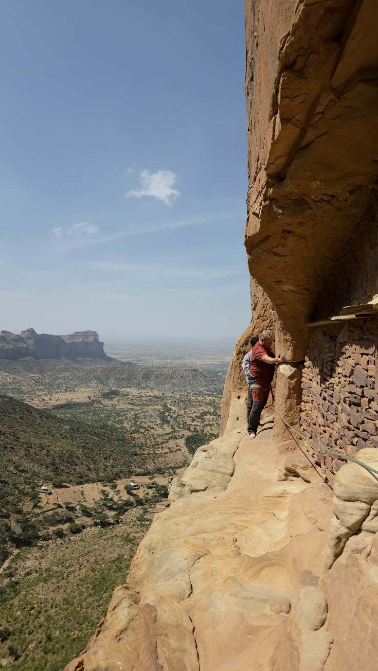Abune Yemata Guh is a 5th-century rock-hewn church in Ethiopia’s Tigray region, famous for its perilous, steep climb up a cliff face and its well-preserved 5th-century frescoes and murals. These paintings depict religious scenes, saints, and biblical imagery, with colours that remain vibrant due to the dry mountain climate. It was built in honour of Abuna Yemata, one of the Nine Saints who helped spread Christianity in Ethiopia during the 5th and 6th centuries. It is considered one of the most inaccessible churches in the world, perched nearly 2,580 meters above sea level in the Gheralta Mountains. Still, it remains an active place of worship for its dedicated followers (๐๏ธ 600 ETB, Local guide 3,000 ETB, Sherpas 2,400 ETB).