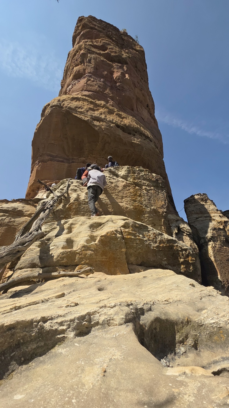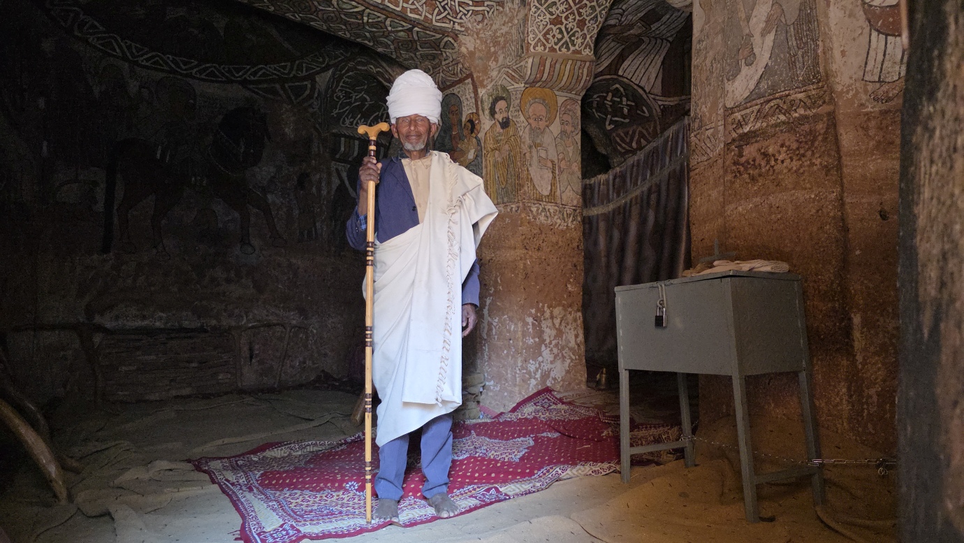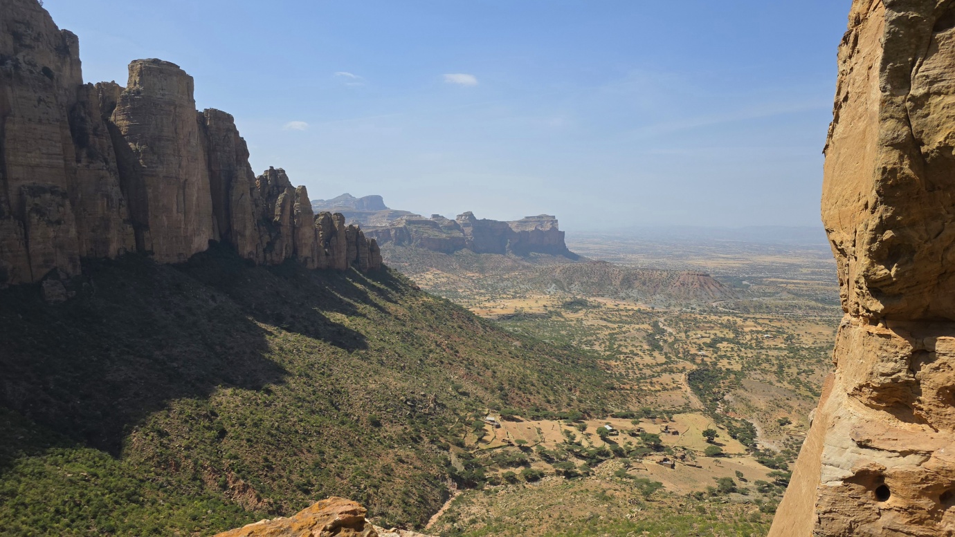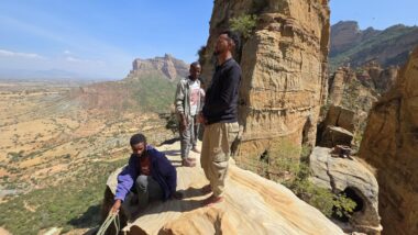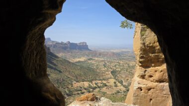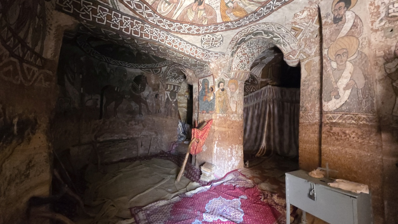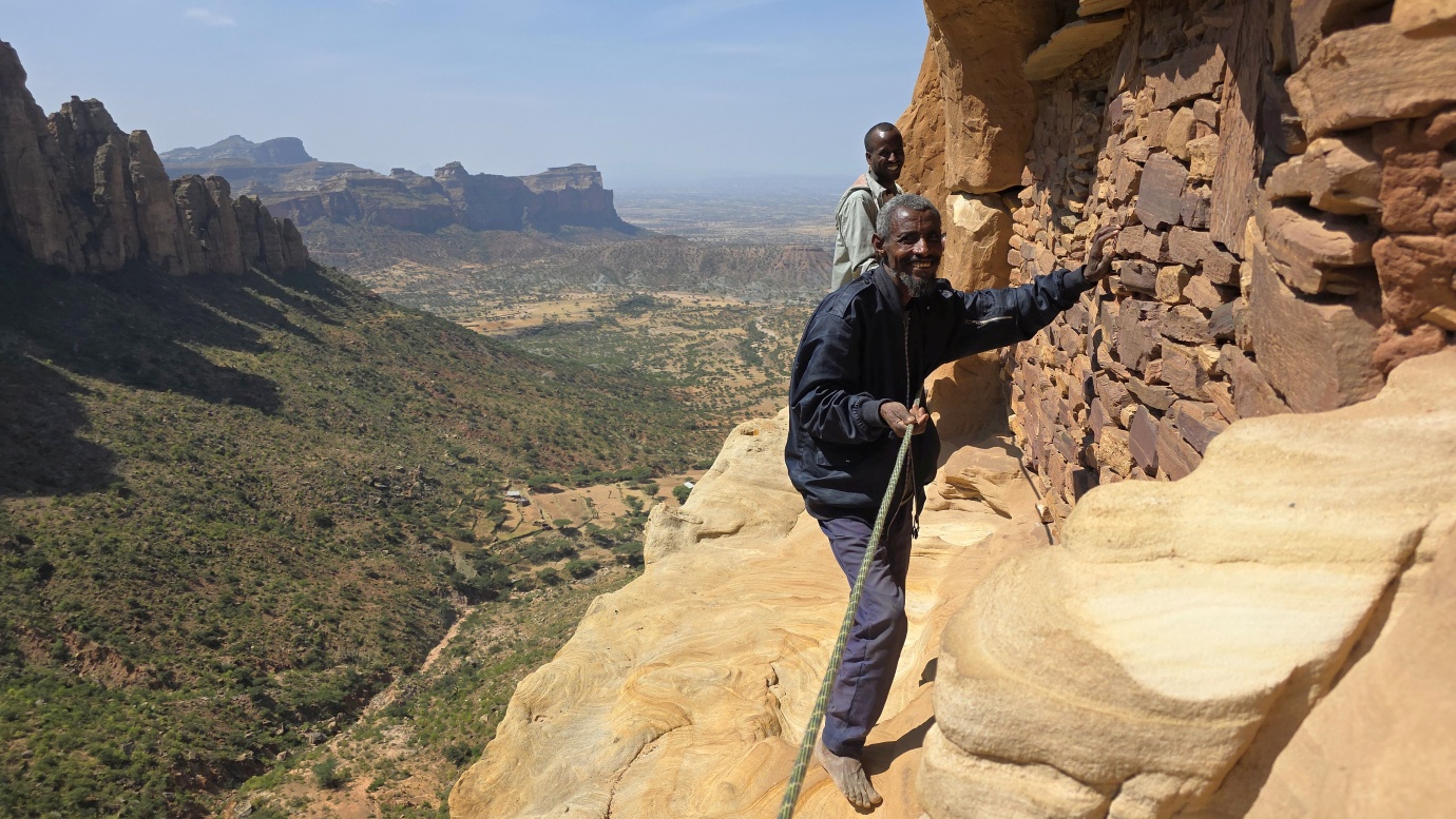 Abune Yemata Guh is a 5th-century rock-hewn church in Ethiopia’s Tigray region, famous for its perilous, steep climb up a cliff face and its well-preserved 5th-century frescoes and murals. These paintings depict religious scenes, saints, and biblical imagery, with colours that remain vibrant due to the dry mountain climate. It was built in honour of Abuna Yemata, one of the Nine Saints who helped spread Christianity in Ethiopia during the 5th and 6th centuries. It is considered one of the most inaccessible churches in the world, perched nearly 2,580 meters above sea level in the Gheralta Mountains. Still, it remains an active place of worship for its dedicated followers (๐๏ธ 600 ETB, Local guide 3,000 ETB, Sherpas 2,400 ETB).