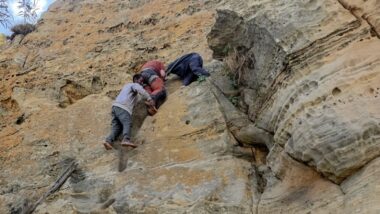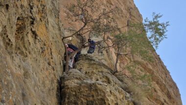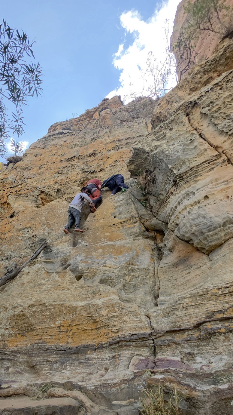 The only way to reach it was via a challenging, dangerous climb that involved scaling a sheer rock wall, crossing narrow ledges, and walking on exposed cliffs with only hand- and footholds carved into the rock. The final stretch required significant physical strength and courage, with a sheer drop on one side of a rocky ledge.