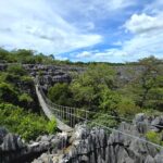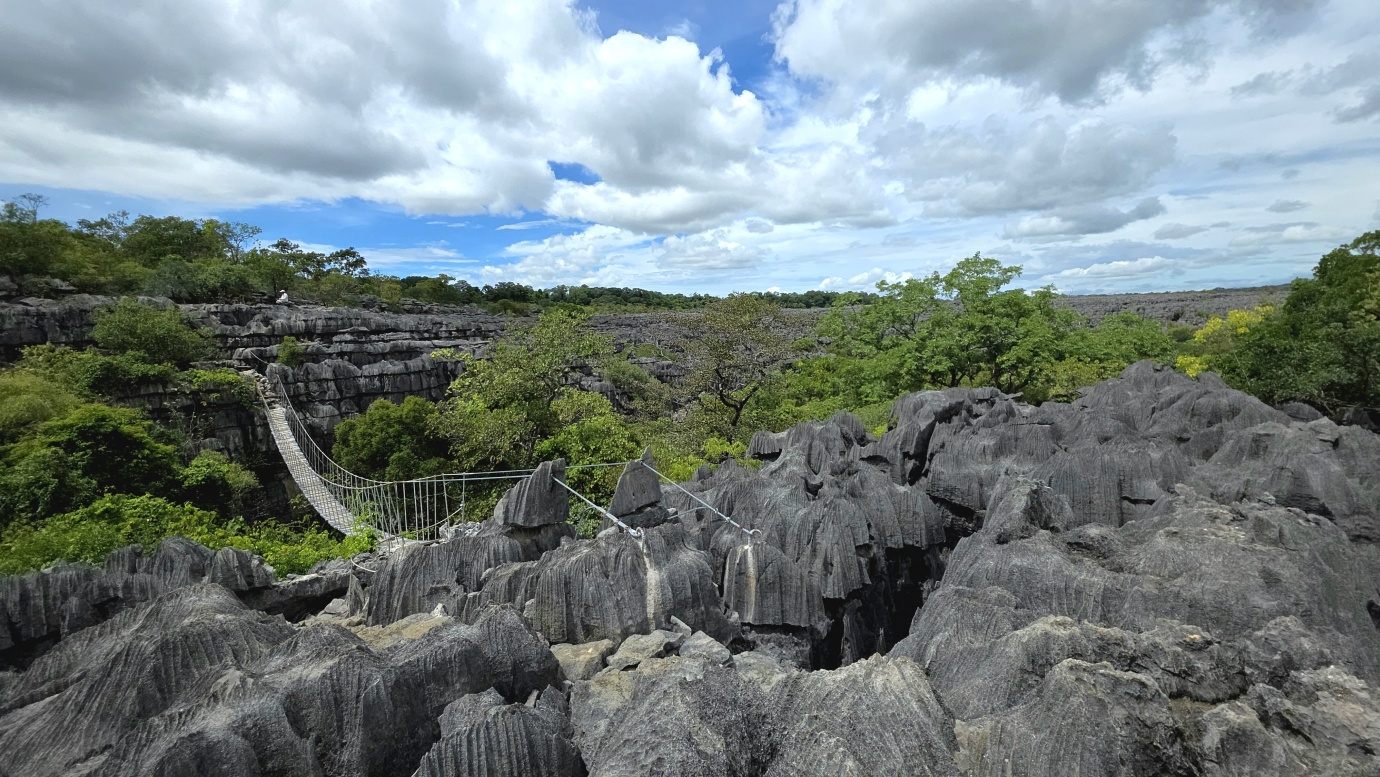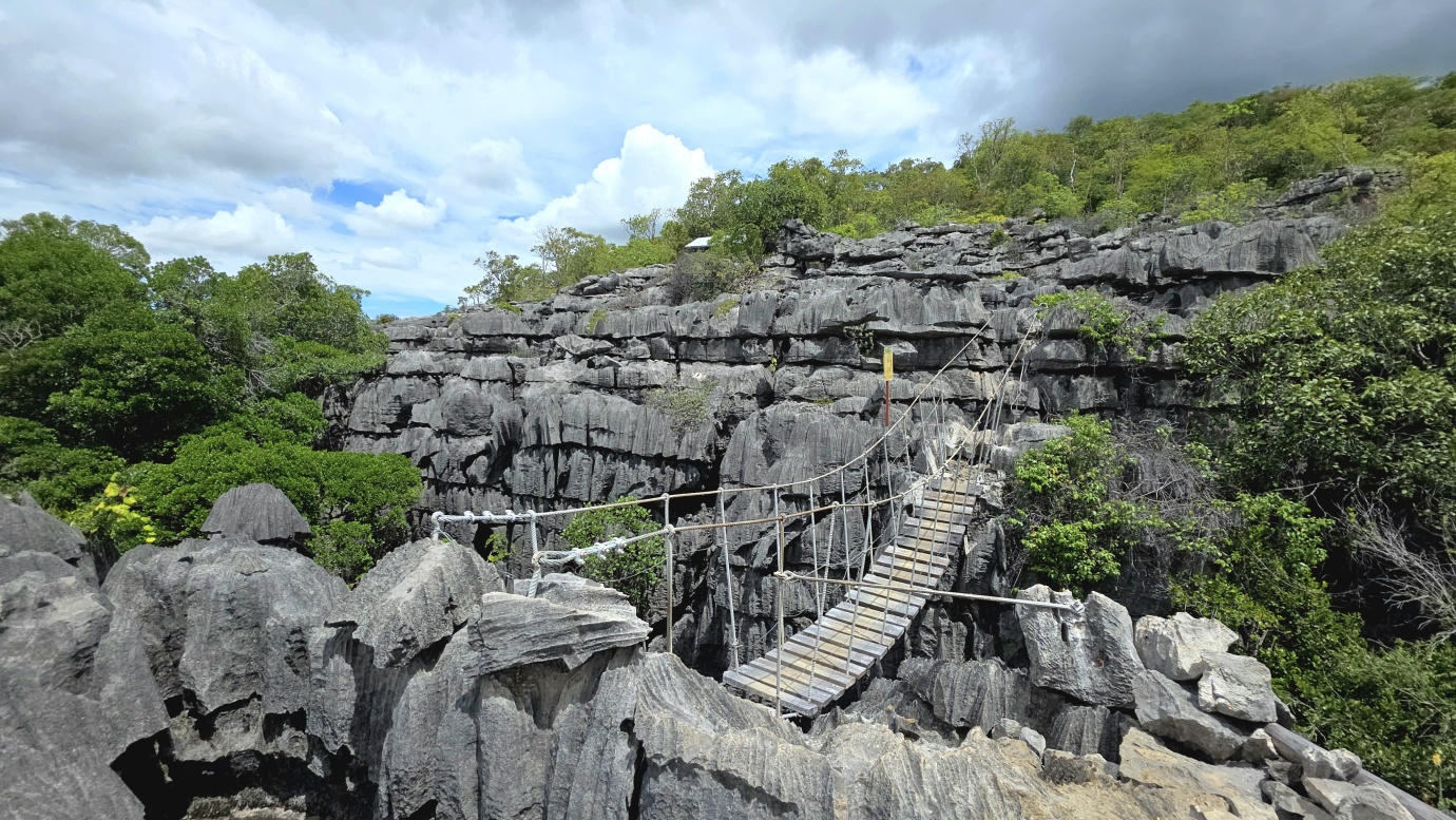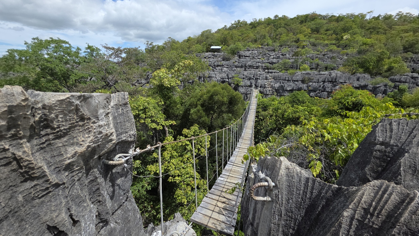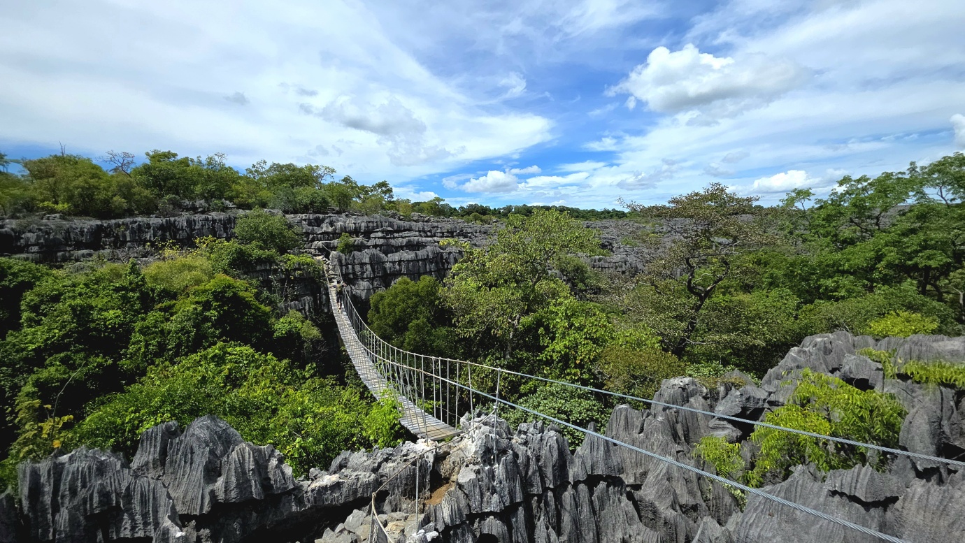 We set off early to avoid the midday heat, embarking on a 4-hour, 8-kilometre hike (🎟️ 69,000 MGA; guide: 70,000 MGA) through the razor-sharp Tsingy Meva formations—jagged limestone pinnacles sculpted by erosion—and the surrounding dry forest. The trail included high suspension bridges, scenic viewpoints with sweeping views over the karst landscape, and frequent chances to spot lemurs, chameleons, and a variety of bird species.