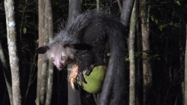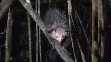 The Aye-aye is the world’s largest nocturnal primate. It is characterised by its continuously growing rodent-like teeth and, in Malagasy culture, is sometimes feared as a bad omen. This strange primate uses echolocation-like behaviour to detect insects hidden inside wood, then skillfully extracts them with precision. We witnessed their unique adaptations, including their large, echo-locating ears and long, thin middle finger used to extract grubs.