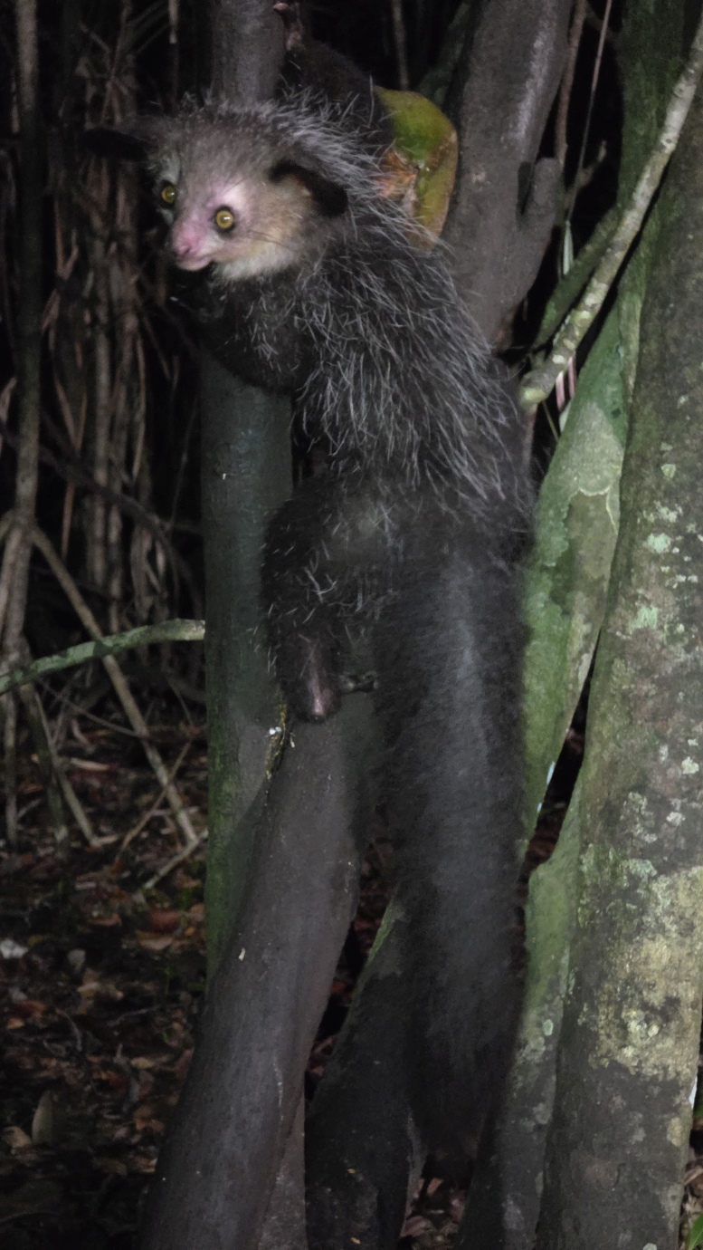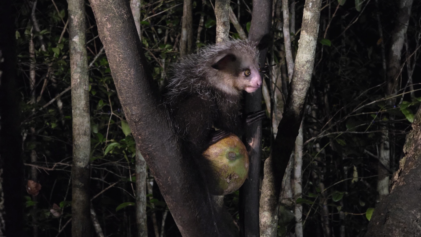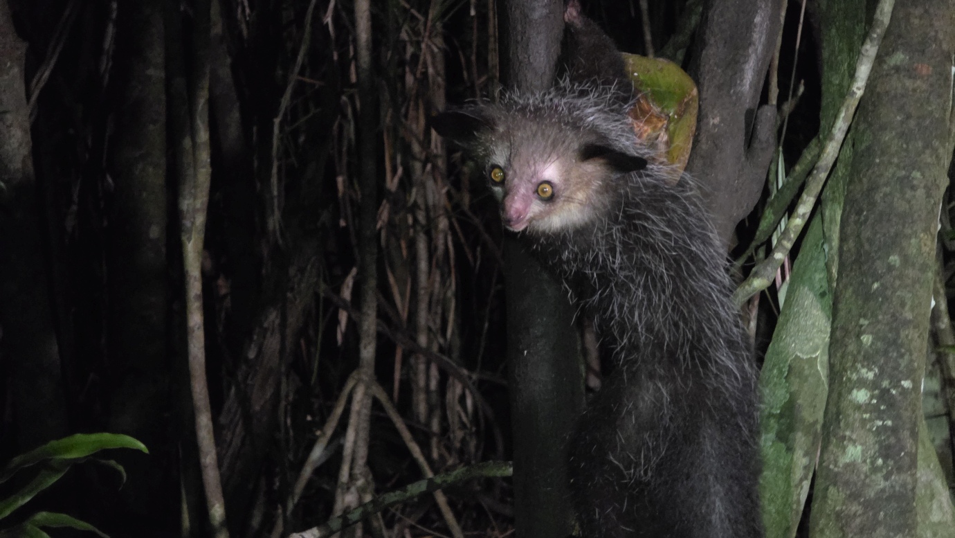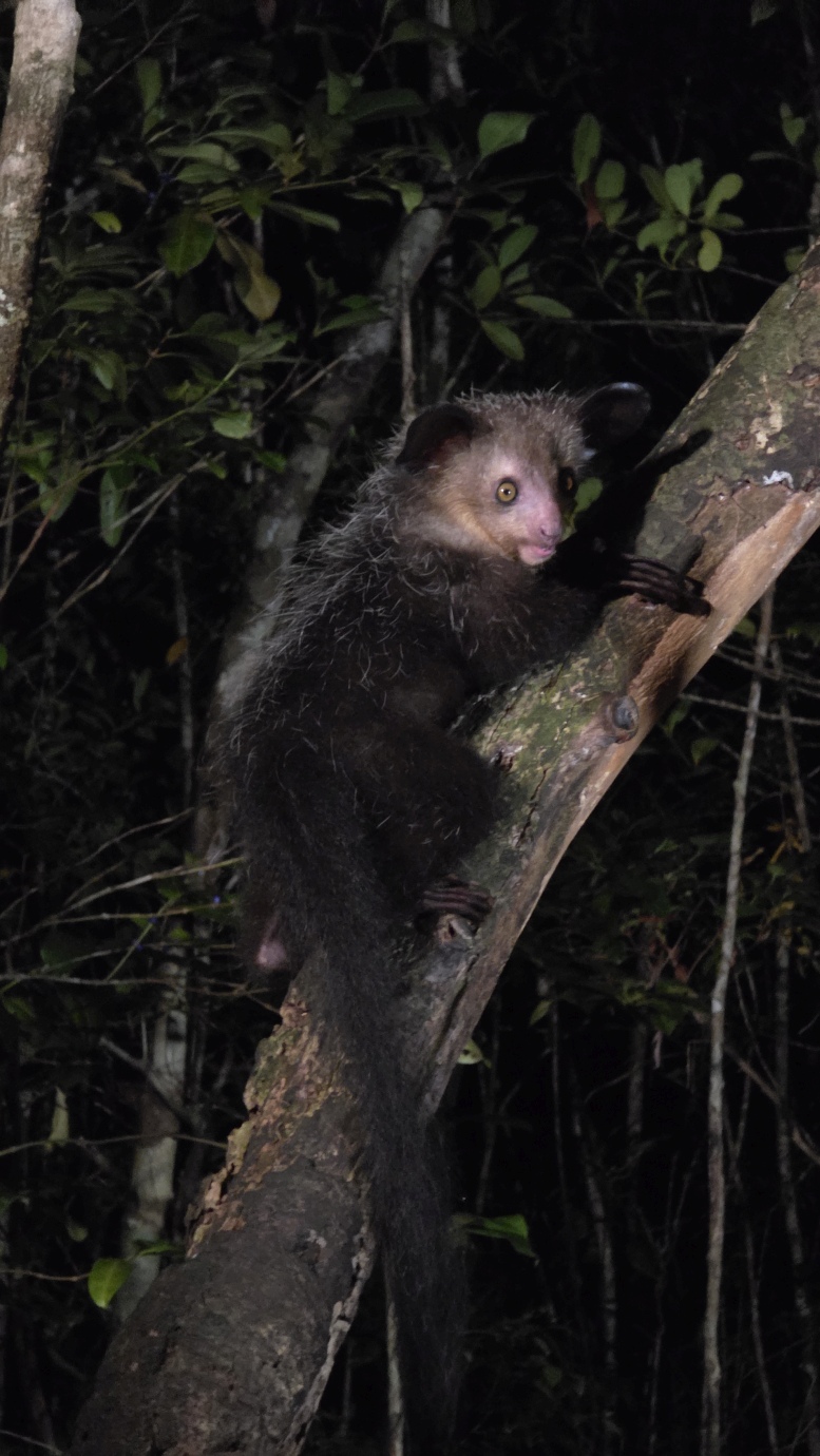 The Aye-aye is the world’s largest nocturnal primate. It is characterised by its continuously growing rodent-like teeth and, in Malagasy culture, is sometimes feared as a bad omen. This strange primate uses echolocation-like behaviour to detect insects hidden inside wood, then skillfully extracts them with precision. We witnessed their unique adaptations, including their large, echo-locating ears and long, thin middle finger used to extract grubs.