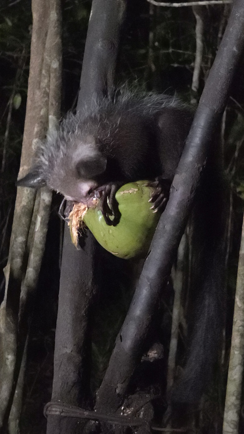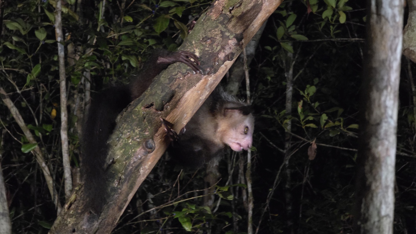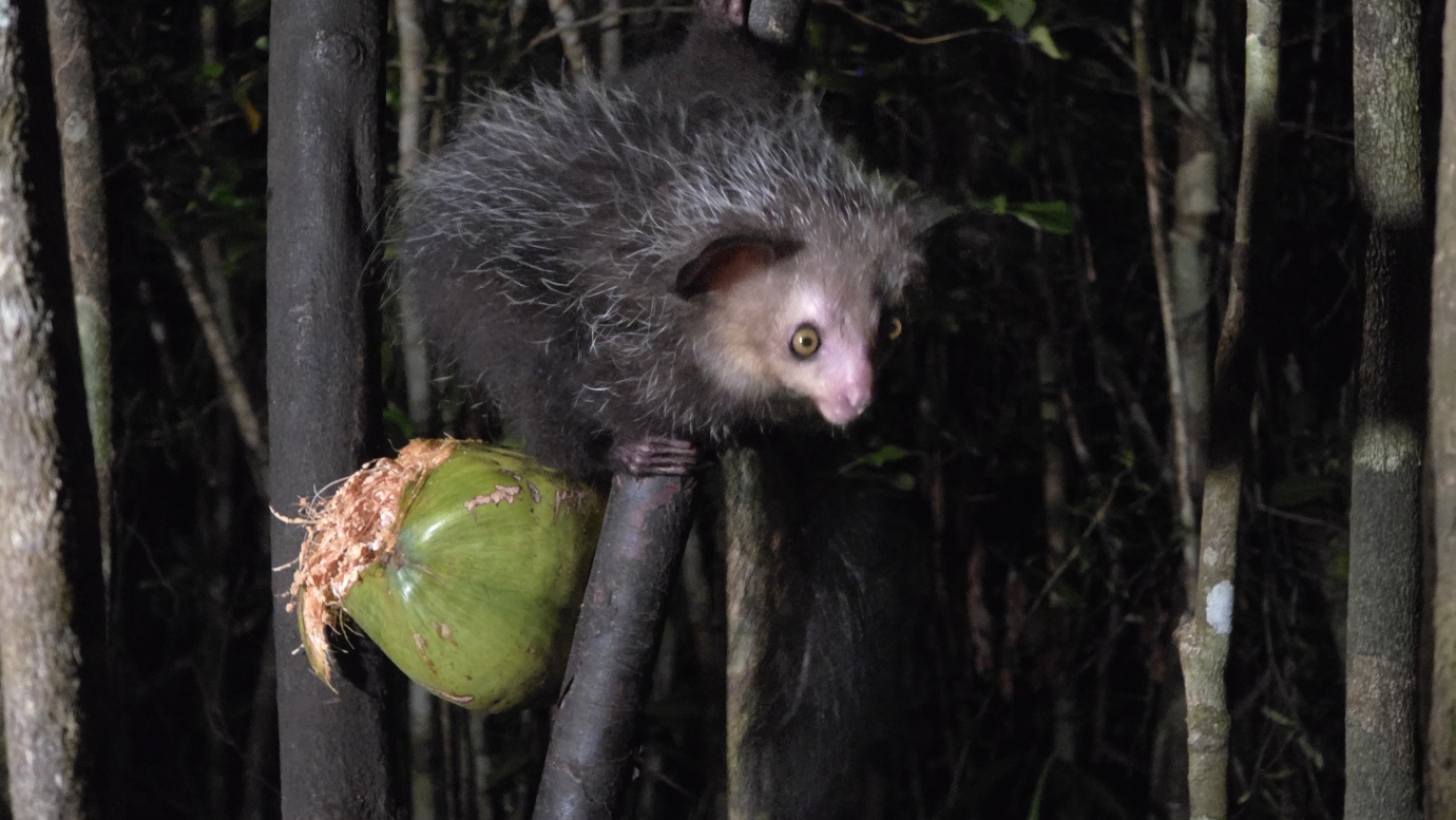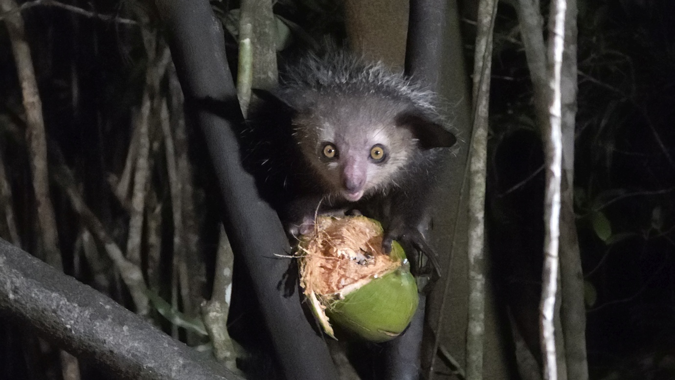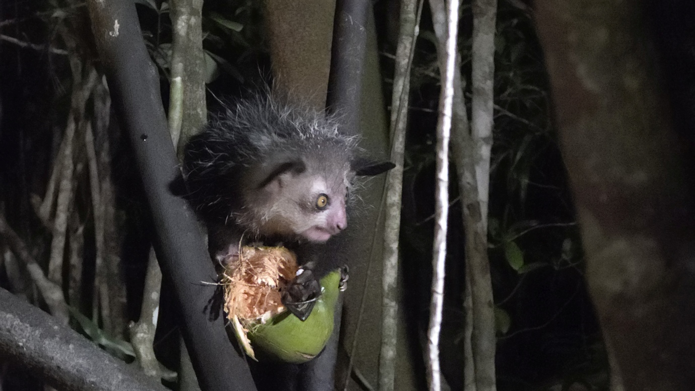 The Aye-aye is the world’s largest nocturnal primate. It is characterised by its continuously growing rodent-like teeth and, in Malagasy culture, is sometimes feared as a bad omen. This strange primate uses echolocation-like behaviour to detect insects hidden inside wood, then skillfully extracts them with precision. We witnessed their unique adaptations, including their large, echo-locating ears and long, thin middle finger used to extract grubs.