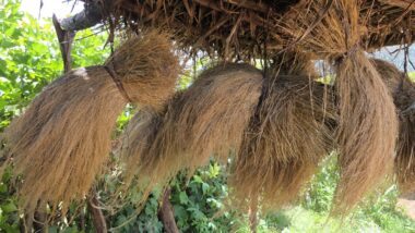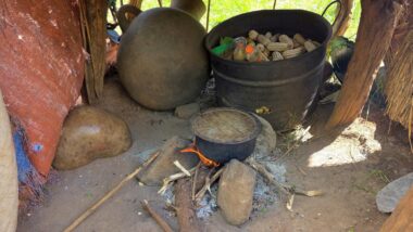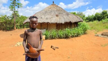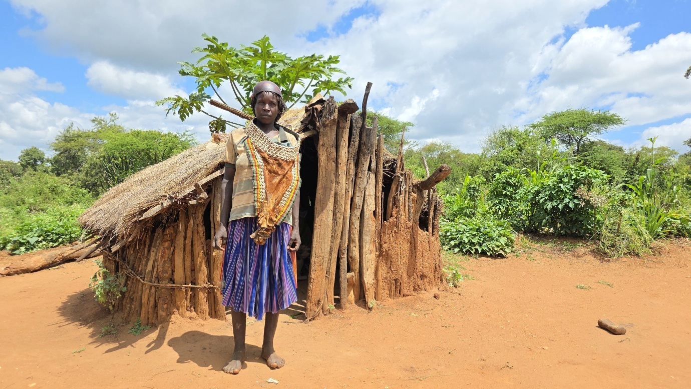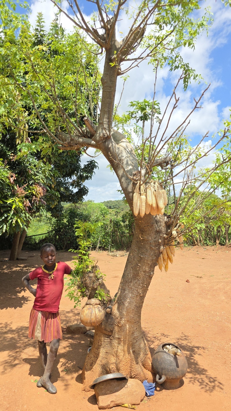 Our last visit today, with our guide (1,000 ETB) from Key Afer, was to the village of the Banna tribe (1,000 ETB). The Banna (or Benna) are an ethnic group in Ethiopia’s Southern Omo Valley region, known for their semi-nomadic lifestyle, distinctive traditions, and close relationship with the neighbouring Hamar people. They are primarily agriculturalists and pastoralists, raising cattle and goats for milk, meat, and hides. They are also recognised for unique cultural practices, such as the “bull jumping” ceremony for marriage, intricate traditional regalia, and the use of stilts by boys for both practical purposes and play.
