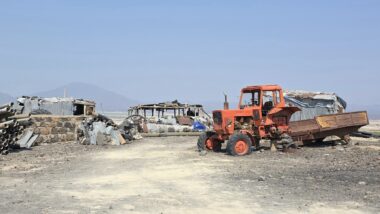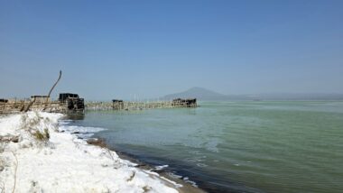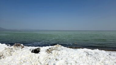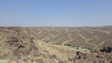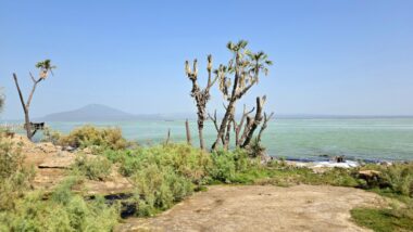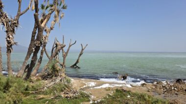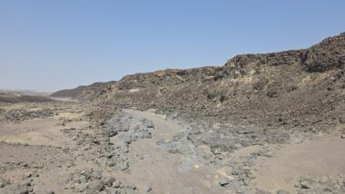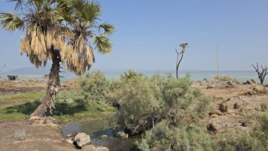 We drove from Semera to Lake Afdera for about 4 hours on an asphalt road, taking us from the city into the increasingly arid, otherworldly Danakil Depression. The scenery transformed from a more populated area to a vast, volcanic, and desert landscape of solidified lava, rock, and sand, with occasional palm-lined oases and small hamlets along the way. It was just a short stop to see salt foam; it’s possible to soak in, but the area around is not nice due to salt extraction, so we skipped that option.