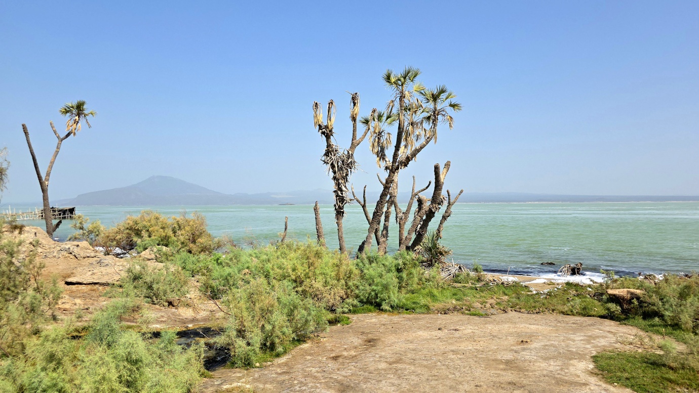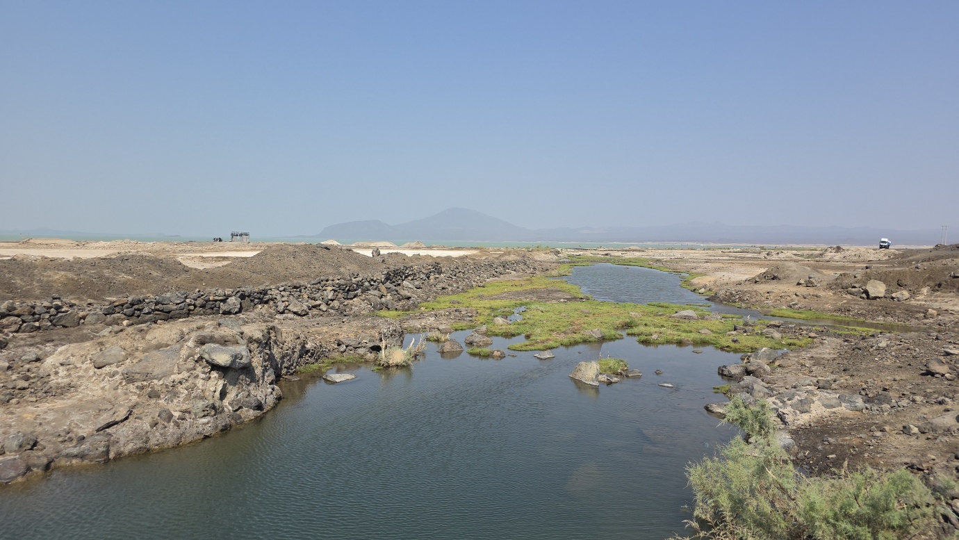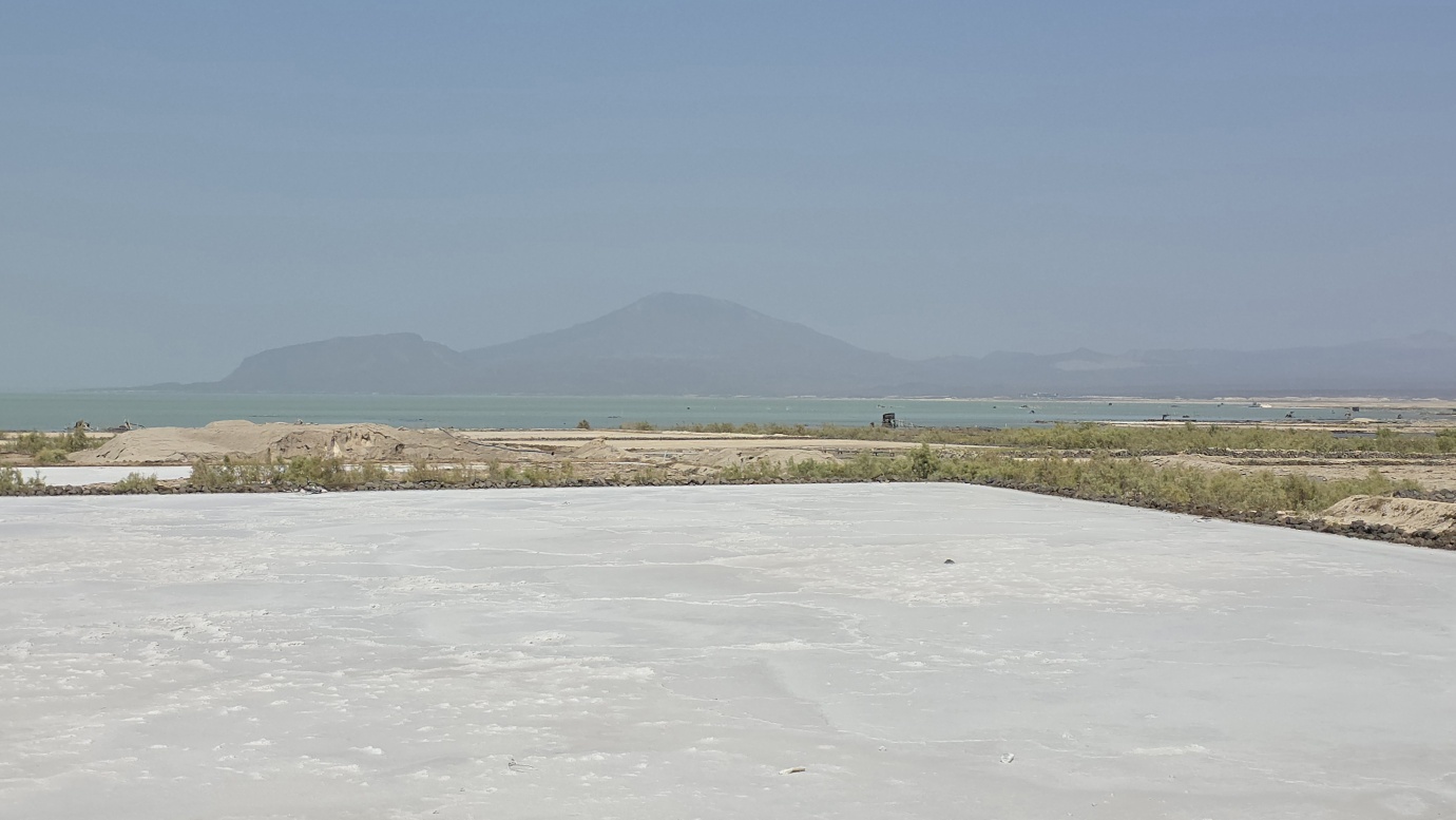 We drove from Semera to Lake Afdera for about 4 hours on an asphalt road, taking us from the city into the increasingly arid, otherworldly Danakil Depression. The scenery transformed from a more populated area to a vast, volcanic, and desert landscape of solidified lava, rock, and sand, with occasional palm-lined oases and small hamlets along the way. It was just a short stop to see salt foam; it’s possible to soak in, but the area around is not nice due to salt extraction, so we skipped that option.