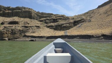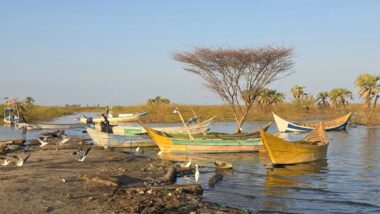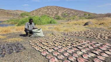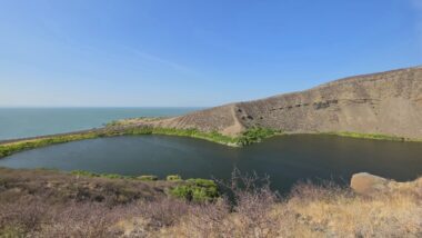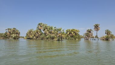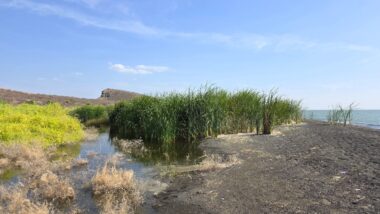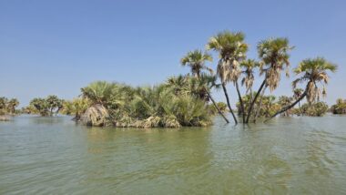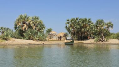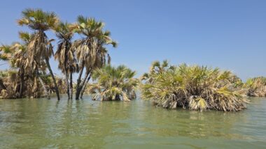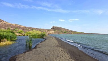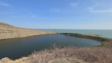 Lake Turkana is the world’s largest permanent desert lake, a saline, alkaline “Jade Sea” in the Rift Valley, known for its volcanic surroundings, rich fossil sites, and abundant Nile crocodiles. It has a unique geography centred around Central Island, an active volcanic cone with three crater lakes (Crocodile, Flamingo, Tilapia) that host diverse wildlife and significant biodiversity, forming a vital part of the UNESCO World Heritage site, Lake Turkana National Parks. The surrounding area is extremely hot and arid, classified as desert and xeric shrubland, receiving less than 250 mm of rainfall annually. Strong, sudden winds are frequent. The lake’s primary perennial water source is the Omo River from the Ethiopian Highlands, which provides about 90% of its inflow.