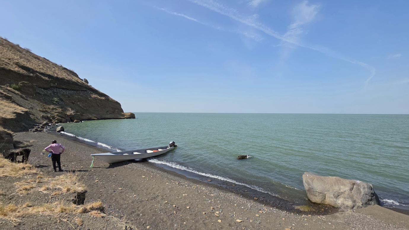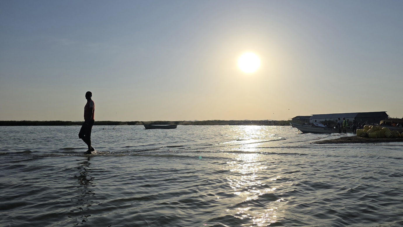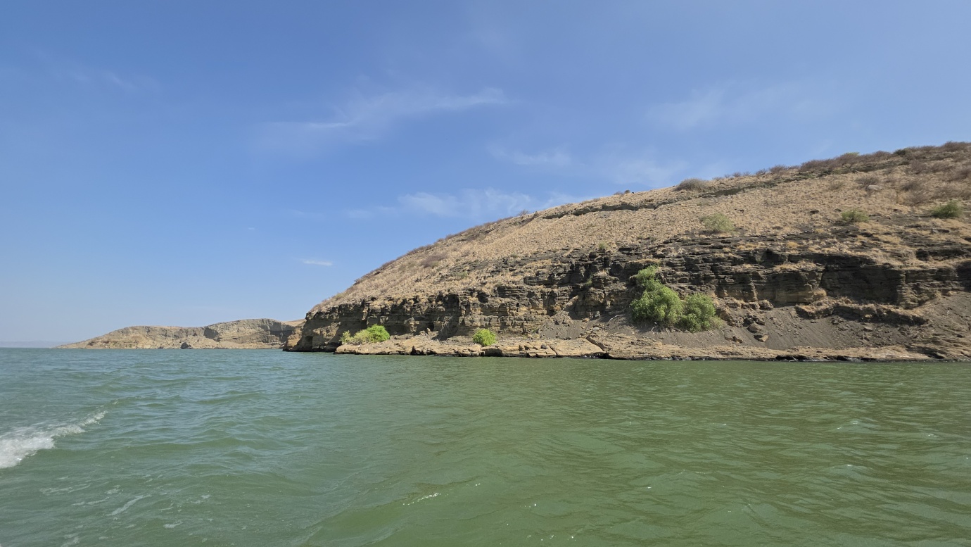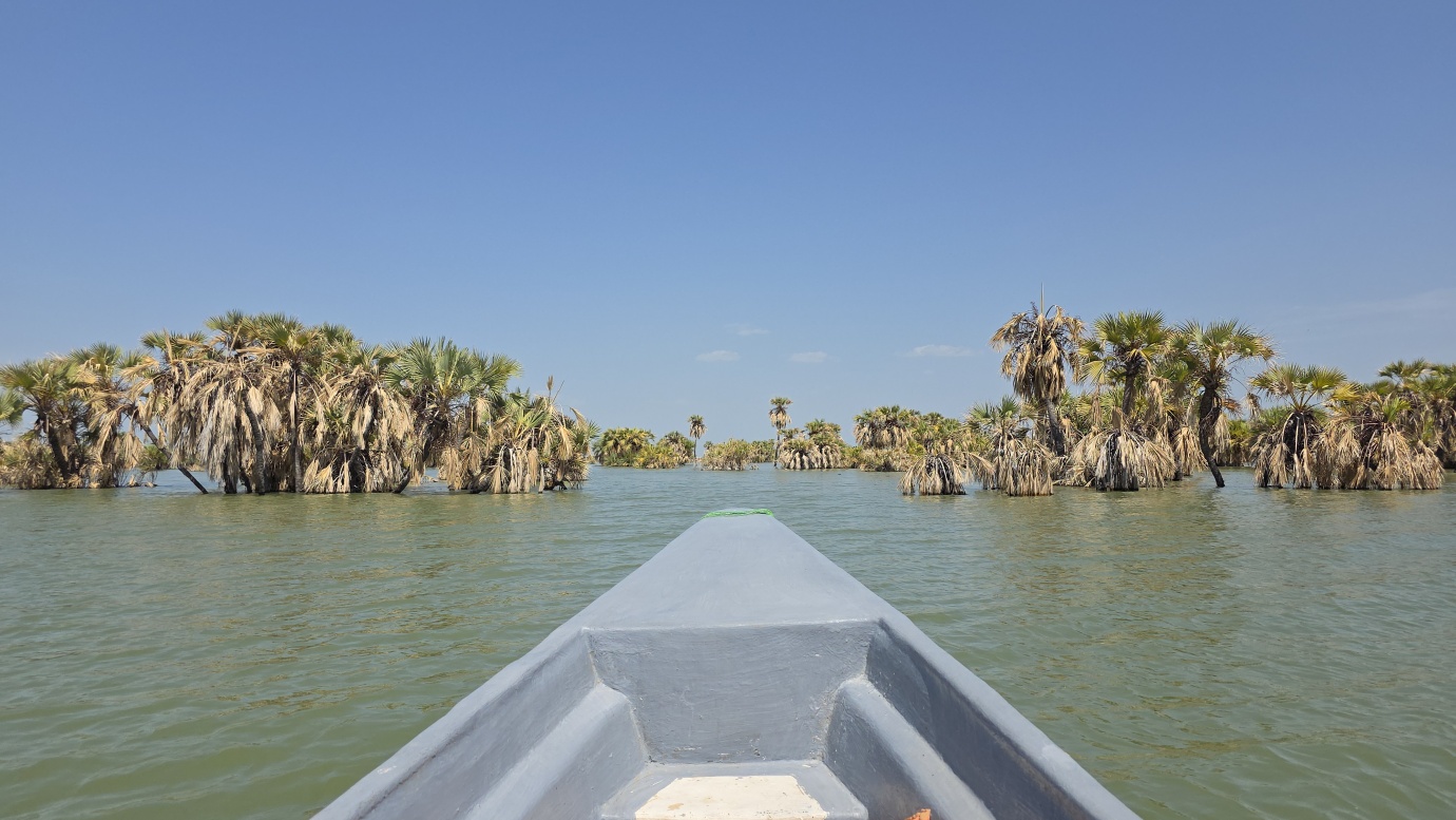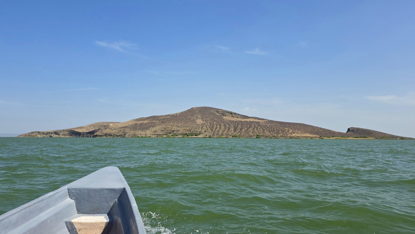 After a two-day drive, we finally arrived in Lodwar around 11 in the morning, but immediately continued for another hour to Kalokol to catch our boat to visit the lake. After complicated negotiations, we agreed to hire the fishing boat with a 40hp engine for 15,000 KES and jumped in. Nobody told us in advance that the lake was rough with one-meter waves, so the small fishing-boat ride was perilous, and we can’t really recommend it. Probably, we were supposed to look for a bigger boat.