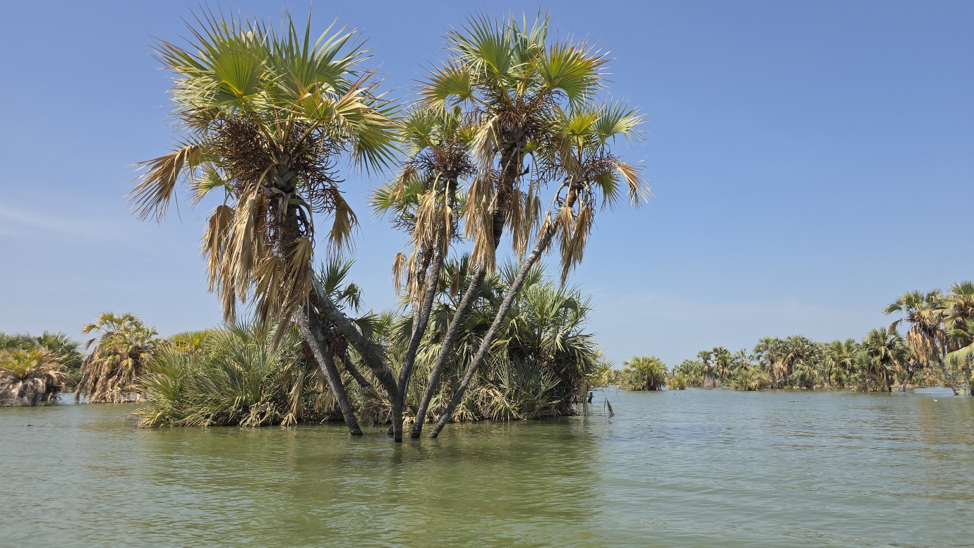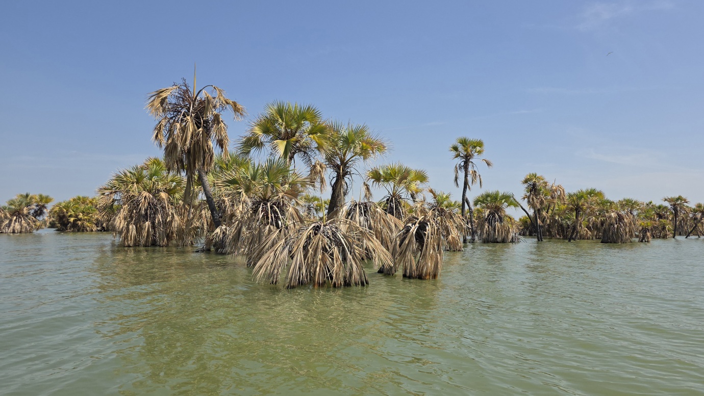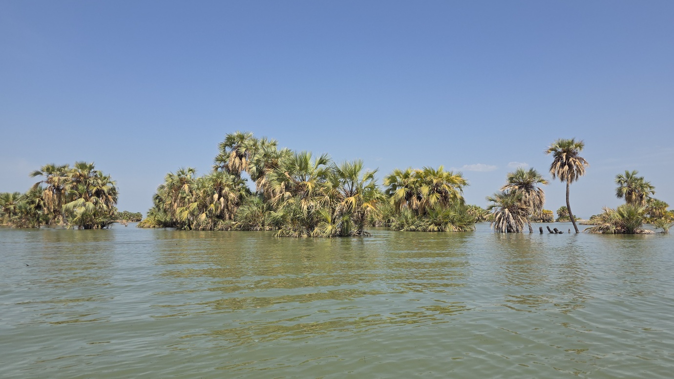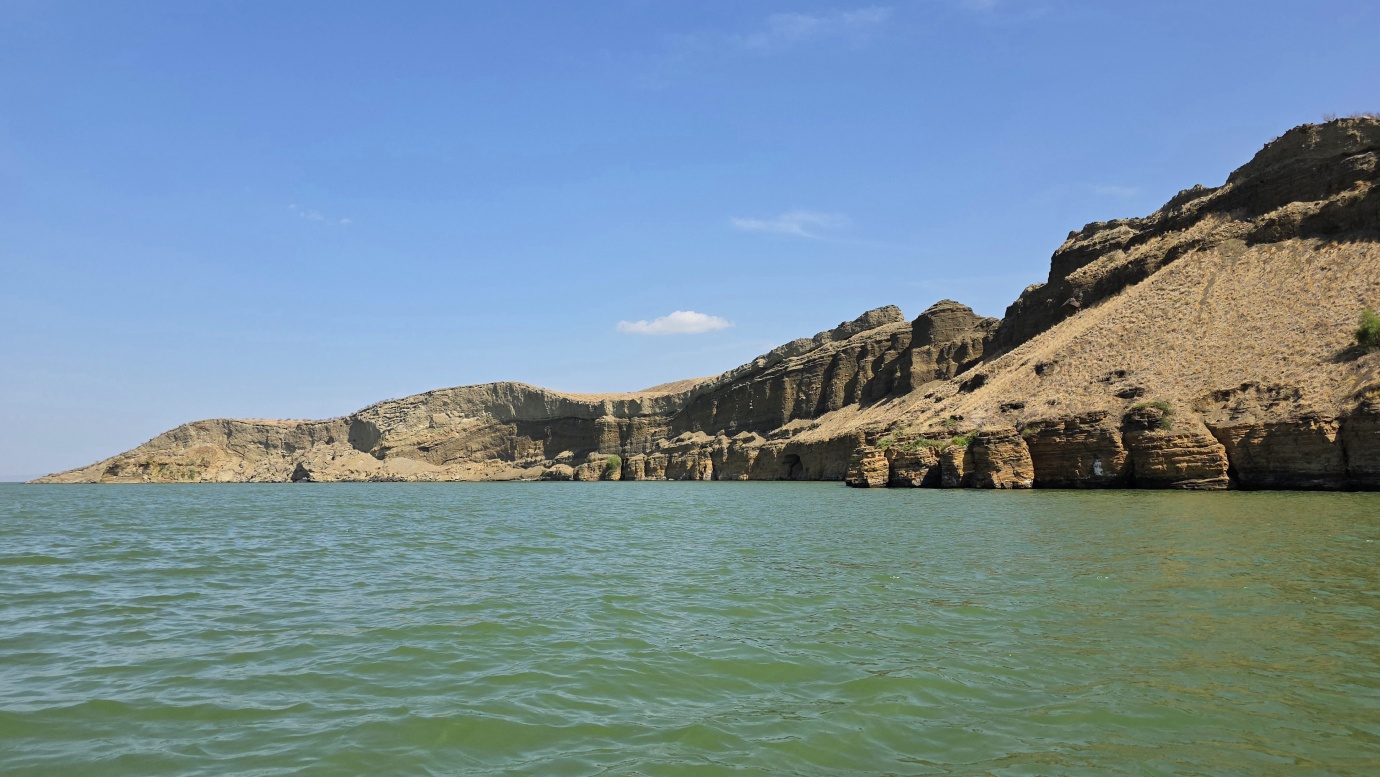 Lake Turkana is the world’s largest permanent desert lake, a saline, alkaline “Jade Sea” in the Rift Valley, known for its volcanic surroundings, rich fossil sites, and abundant Nile crocodiles. It has a unique geography centred around Central Island, an active volcanic cone with three crater lakes (Crocodile, Flamingo, Tilapia) that host diverse wildlife and significant biodiversity, forming a vital part of the UNESCO World Heritage site, Lake Turkana National Parks. The surrounding area is extremely hot and arid, classified as desert and xeric shrubland, receiving less than 250 mm of rainfall annually. Strong, sudden winds are frequent. The lake’s primary perennial water source is the Omo River from the Ethiopian Highlands, which provides about 90% of its inflow.