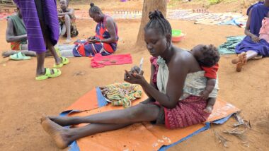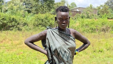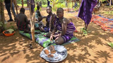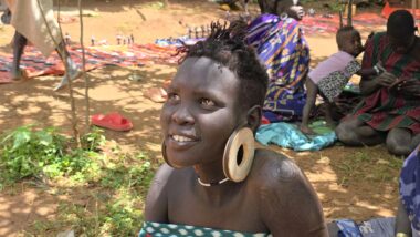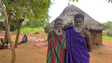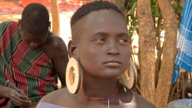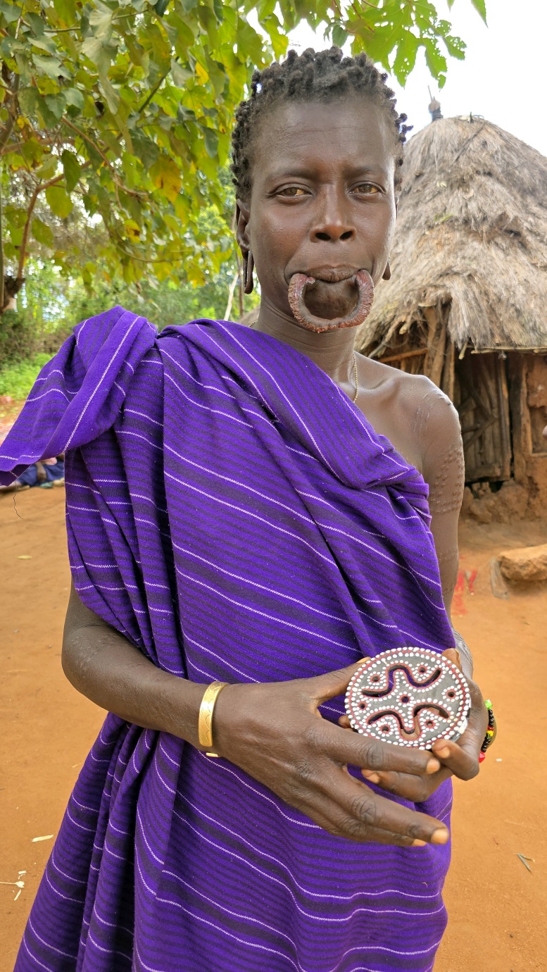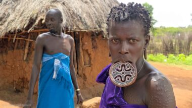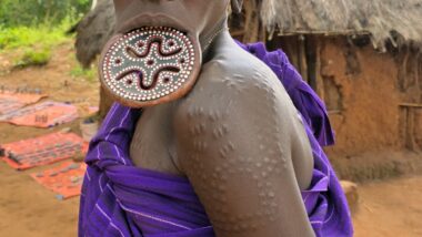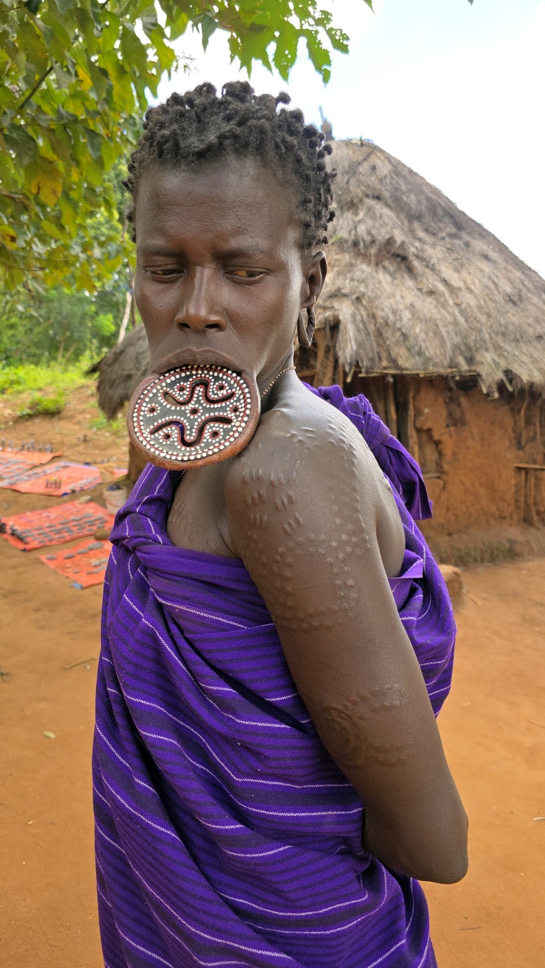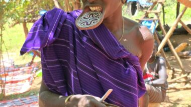 Mursi women are famous for wearing large clay or wooden lip plates in their lower lips. The process involves cutting the lip and gradually stretching it over time. The size of the plate can signify female social adulthood, beauty, and social status. The men engage in a form of ceremonial duelling using two-meter wooden poles called “donga.” The contests often end when one man is injured or falls.