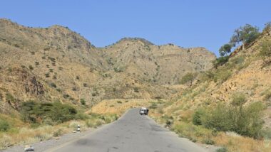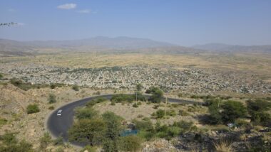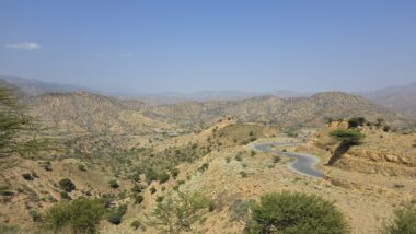 After a visit to the Dallol Pools, we start our long drive. The road climbed steeply out of the low-lying depression toward Mekele, which is situated at an elevation of around 2,100 meters. The road shifted from sandy tracks to more mountainous terrain, and the scenery changed from the surreal, colourful, and hot landscapes of the Danakilโ€”including salt flats and volcanic formationsโ€”to a cooler, rocky landscape dotted with farms and traditional and modern-style villages.