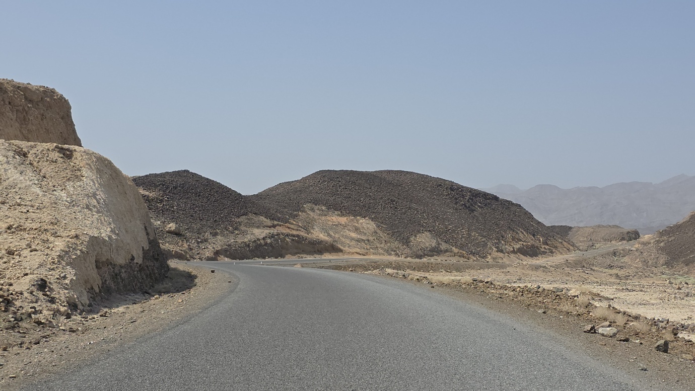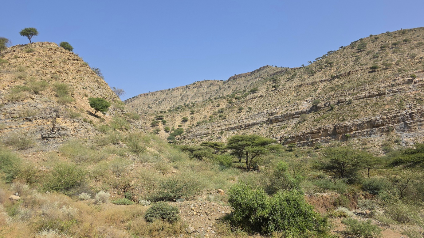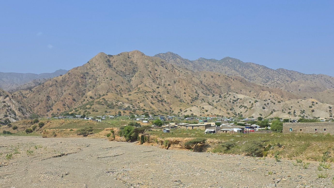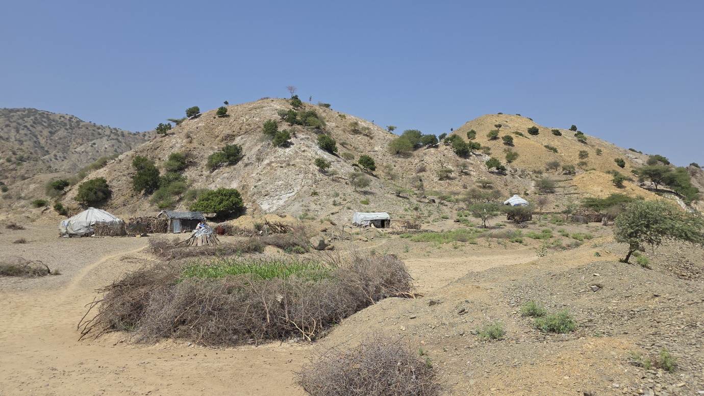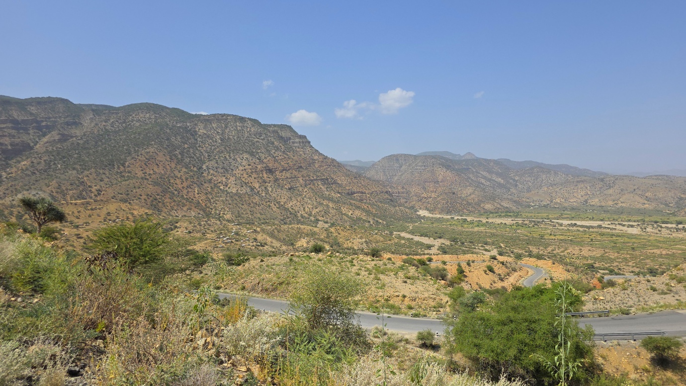 After a visit to the Dallol Pools, we start our long drive. The road climbed steeply out of the low-lying depression toward Mekele, which is situated at an elevation of around 2,100 meters. The road shifted from sandy tracks to more mountainous terrain, and the scenery changed from the surreal, colourful, and hot landscapes of the Danakilโ€”including salt flats and volcanic formationsโ€”to a cooler, rocky landscape dotted with farms and traditional and modern-style villages.