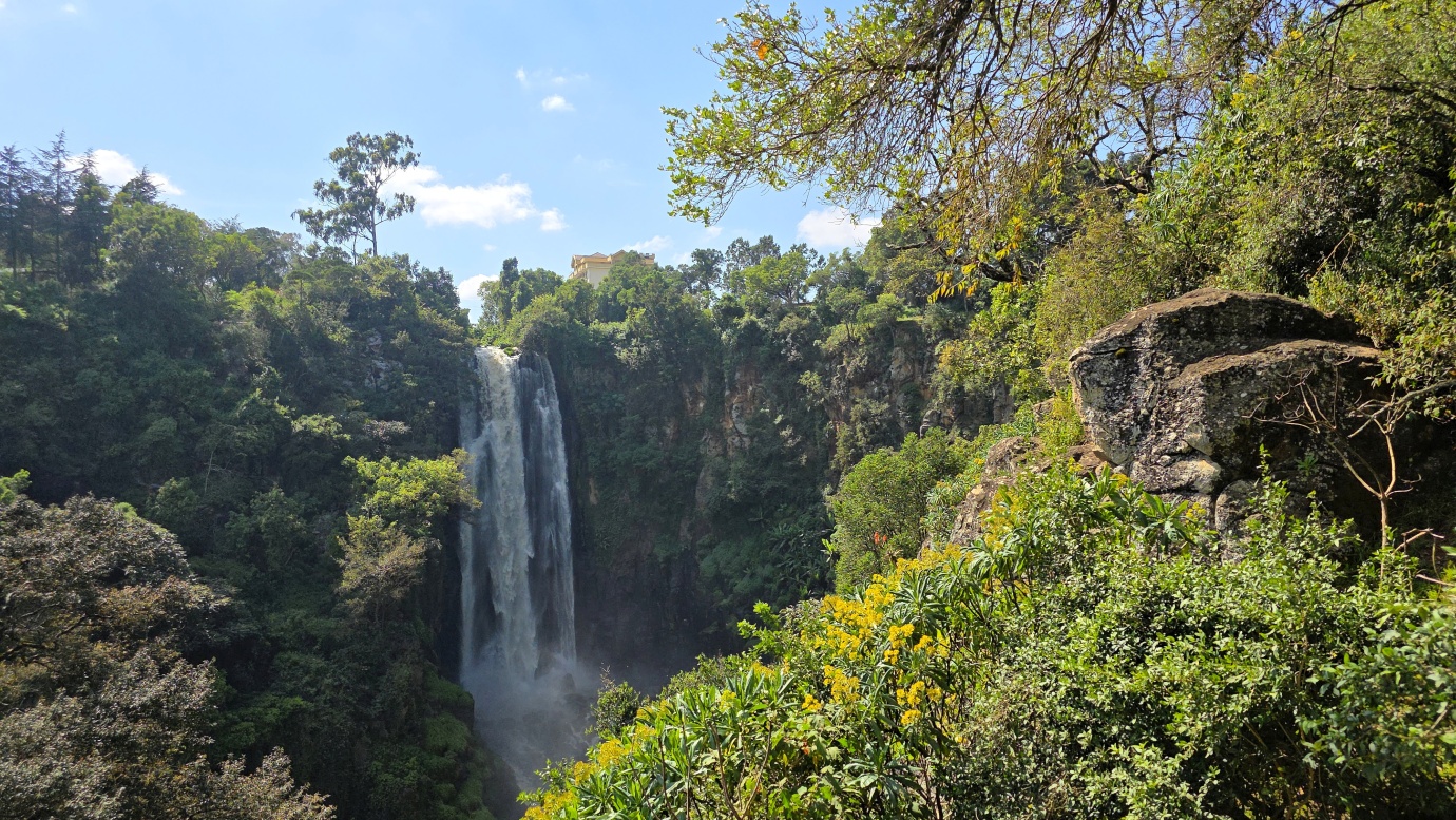 Before we left Nanyuki early in the morning, we made a short stop at the Equator monument next to our parking spot. Then we drove for two hours to Thomson’s Falls, a 74-meter waterfall in Nyahururu, named after Scottish geologist Joseph Thomson. It is a popular tourist destination (🎟️1,000 KES) known for its spectacular viewpoints, nature walks, and a nearby hippo pool upstream. There is a trail down to the base, but some books warn that it’s not safe to visit due to recent robberies. There are quite a few hustlers and hawkers, as well as a group of so-called “local performers” who want to take a photo with tourists for a fee. It was very quiet during our visit, so, just for the effort of dressing like local Maasai and Agikuyu, we gave them 200 KES for the photo (4x 50 KES).