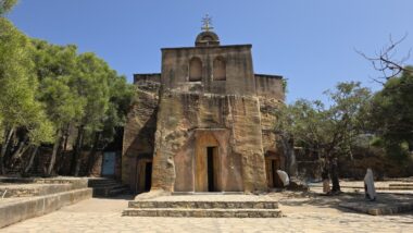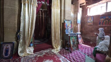 Wukro Chirkos Church (🎟️600 ETB, local guide 1,250 ETB) is a historic rock-hewn church in Ethiopia’s Tigray region, notable for being one of the country’s oldest, dating back to the 4th century. It has been in continuous use for over 1,600 years. It’s a semi-monolithic church carved from a single sandstone rock, with its side walls, roof, and front wall separated from the main rock, but attached at the floor and back wall. The church has a cruciform shape, with unique features like cruciform pillars with swirling sandstone laminates, cubical capitals, a barrel-vaulted ceiling, and an Axumite frieze.