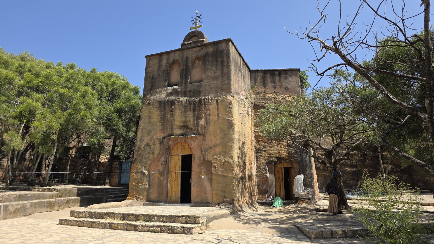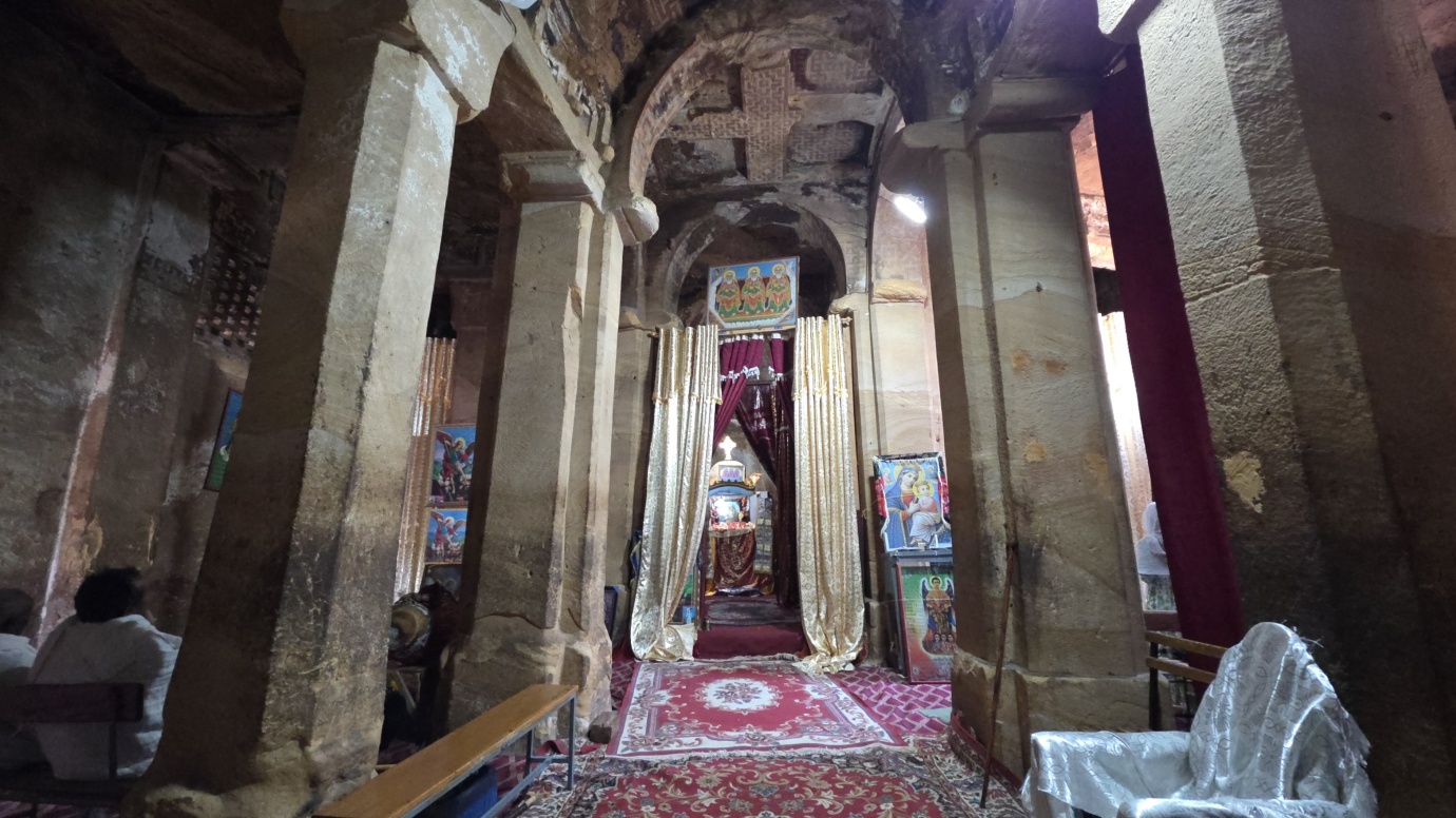 Wukro Chirkos Church (🎟️600 ETB, local guide 1,250 ETB) is a historic rock-hewn church in Ethiopia’s Tigray region, notable for being one of the country’s oldest, dating back to the 4th century. It has been in continuous use for over 1,600 years. It’s a semi-monolithic church carved from a single sandstone rock, with its side walls, roof, and front wall separated from the main rock, but attached at the floor and back wall. The church has a cruciform shape, with unique features like cruciform pillars with swirling sandstone laminates, cubical capitals, a barrel-vaulted ceiling, and an Axumite frieze.